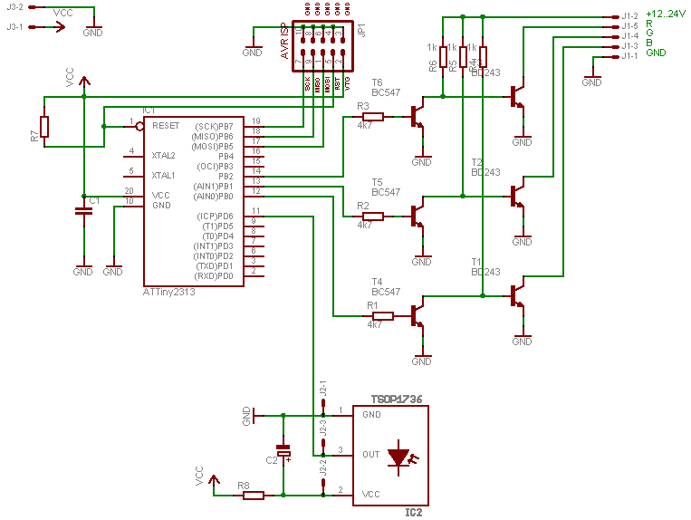 Auch bei dieser Schaltung macht mal wieder ein Tiny2313 die Arbeit obwohl hier auch ein 8Pin AVR wie etwa der Tiny13 reichen würde (hatte keinen da). Die Plackerei übernehmen 3 alte BD243. Die 2 stufigen Treiber könnte man jedoch auch durch modernere N-Kanal Mos-Fets mit Logik-Level austauschen. Die Netzteile für +5 und +24V spar ich mit hier. Der TSOP ist laut Datenblatt beschaltet. Der AVR läuft mit 8 MHz (interner RC Oszilator), bei den Fuse Bits also nur noch den Div8 (Systemtakt / 8) ausschalten.